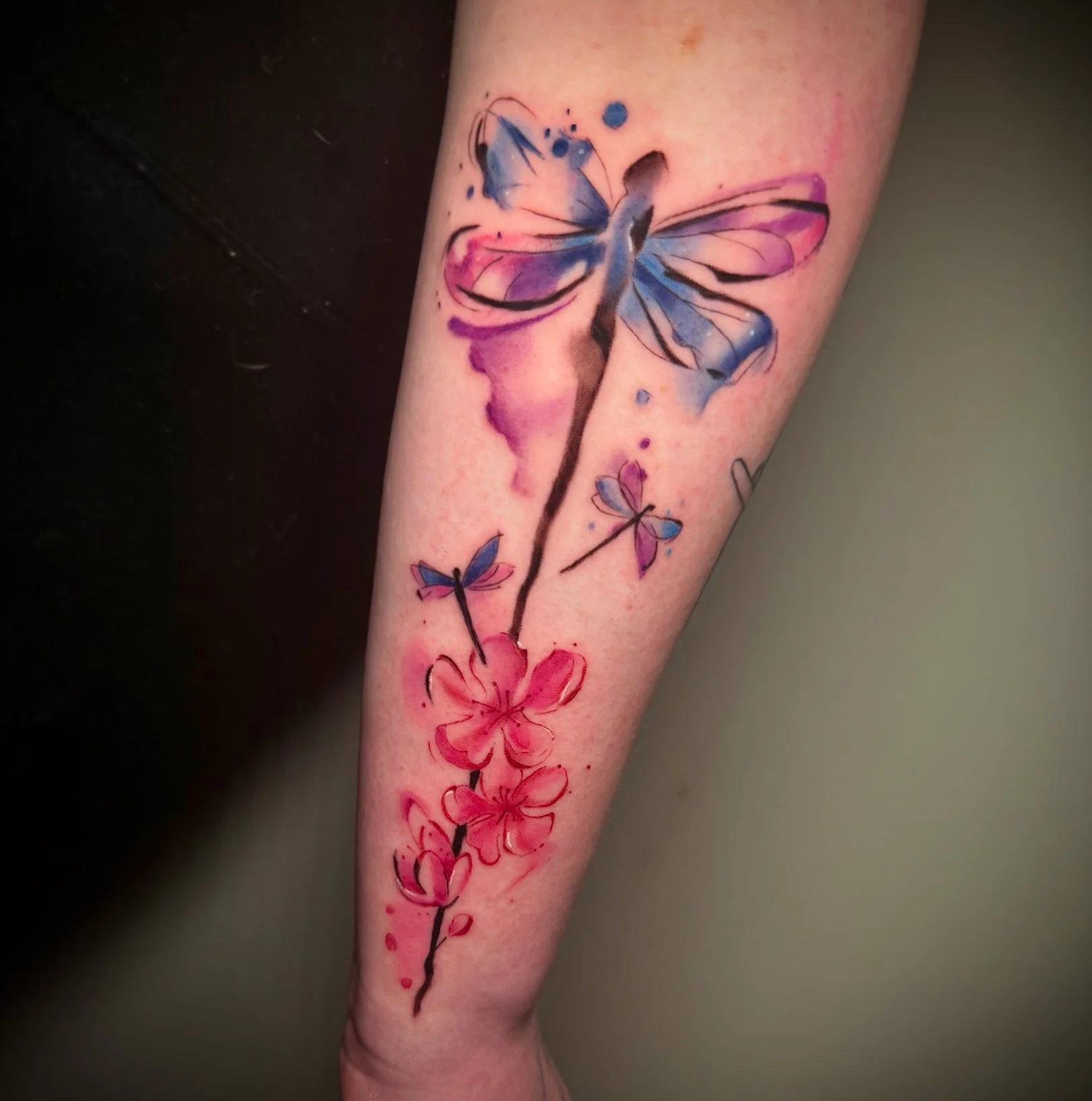 A colorful tattoo of a butterfly and flowers on a person's forearm, featuring watercolor-style pink, blue, and purple hues.