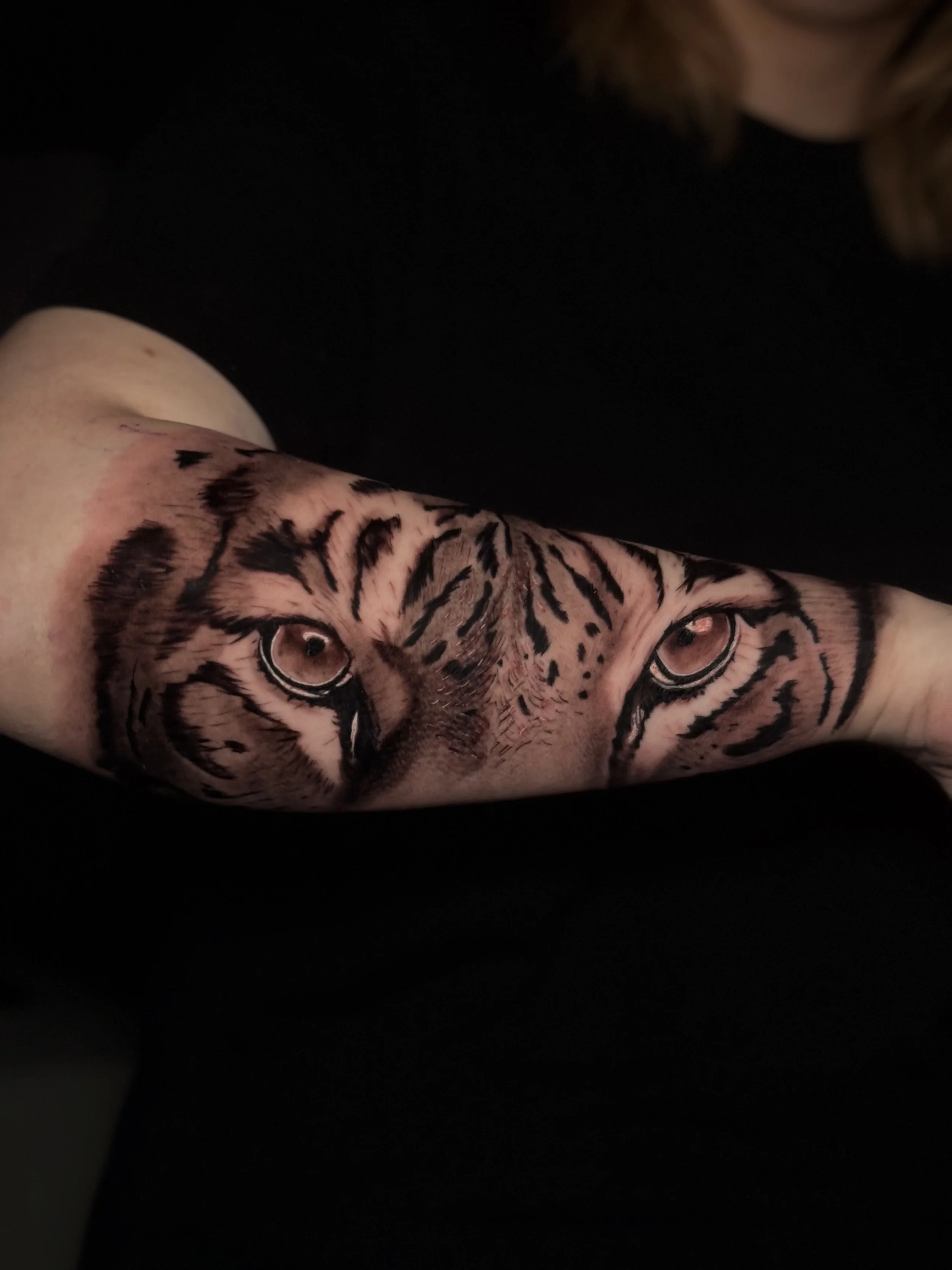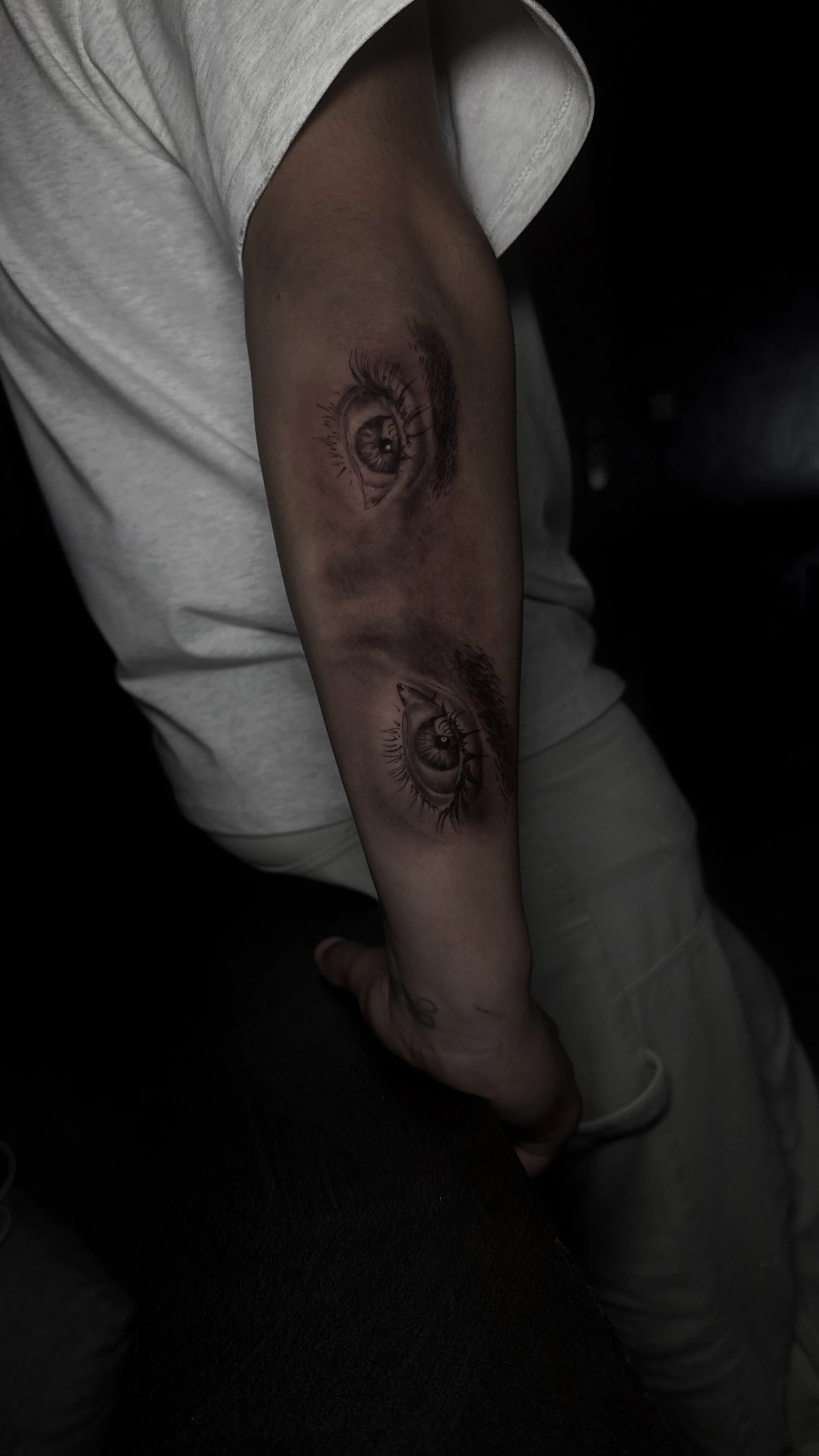 Tattoo von zwei realistischen Augen auf dem Unterarm, detailliert mit Schattierungen und feinen Linien.