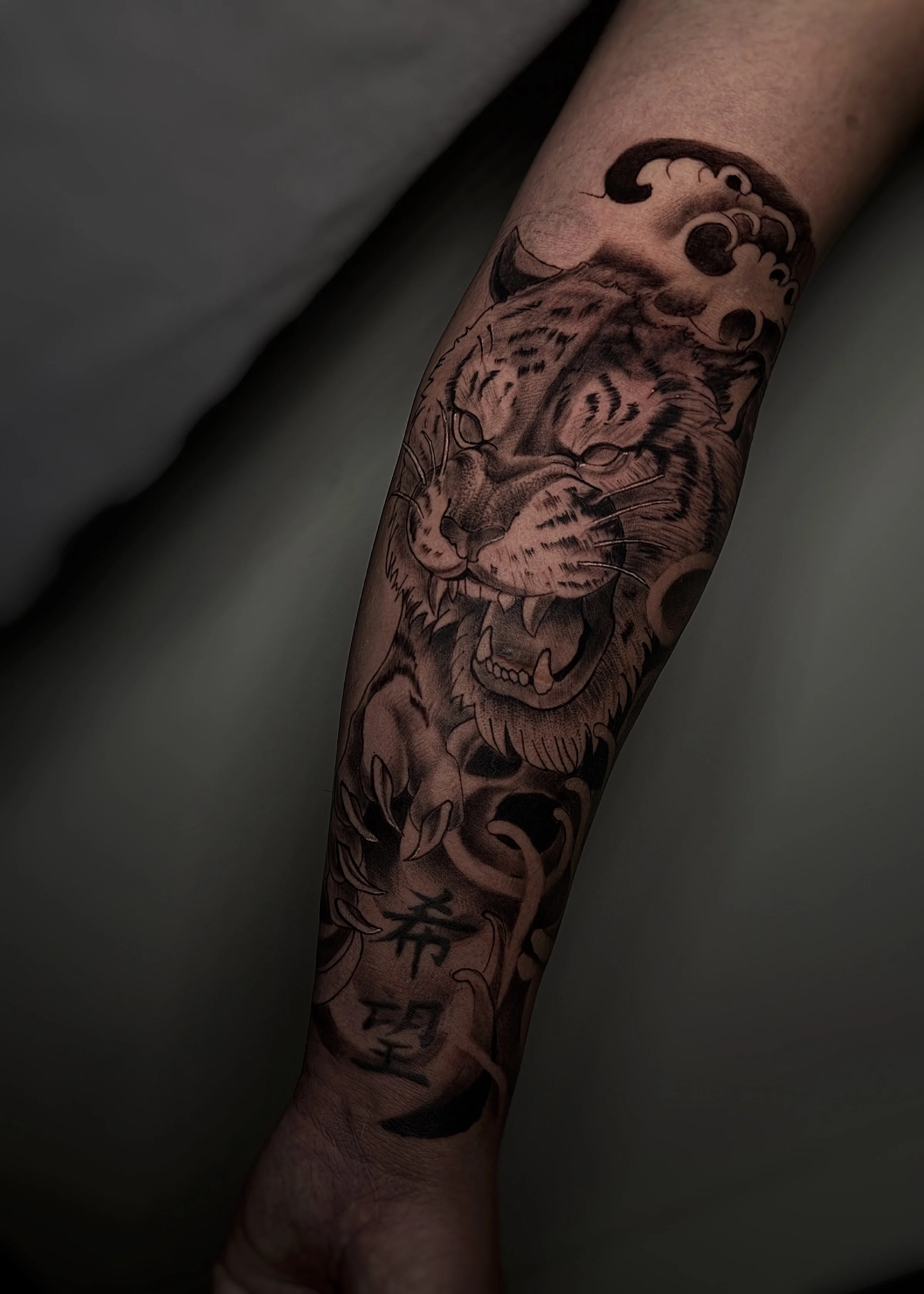 Tattoo eines bösartig wirkenden Löwenkopfs auf dem Unterarm, mit asiatischen Schriftzeichen darunter.