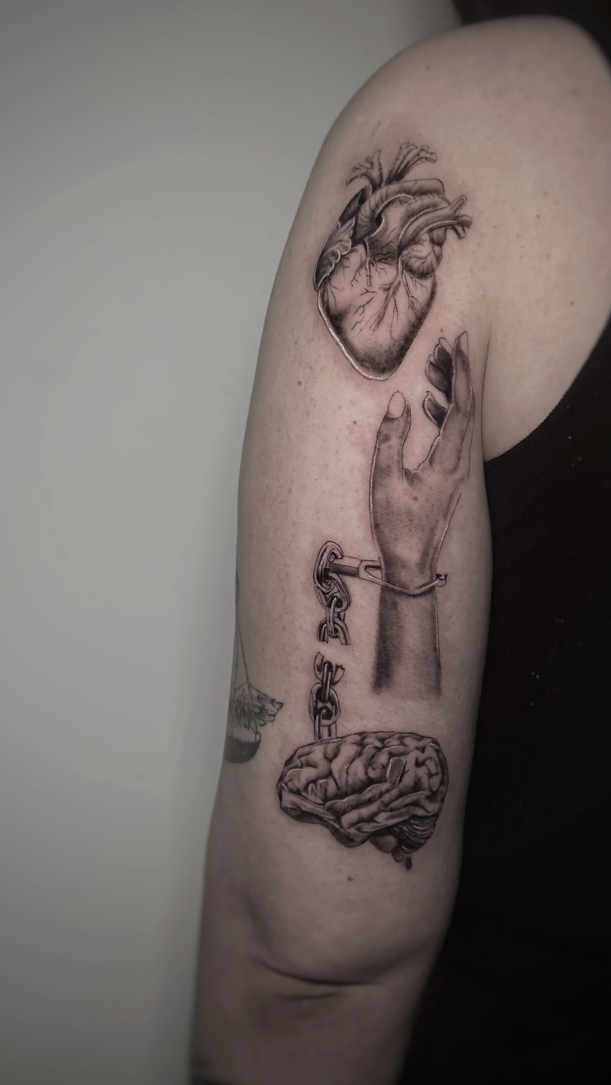 Tattoo eines menschlichen Herzens, einer weiblichen Hand, einer Kette, einem Gehirn und einem Teil einer Flügel