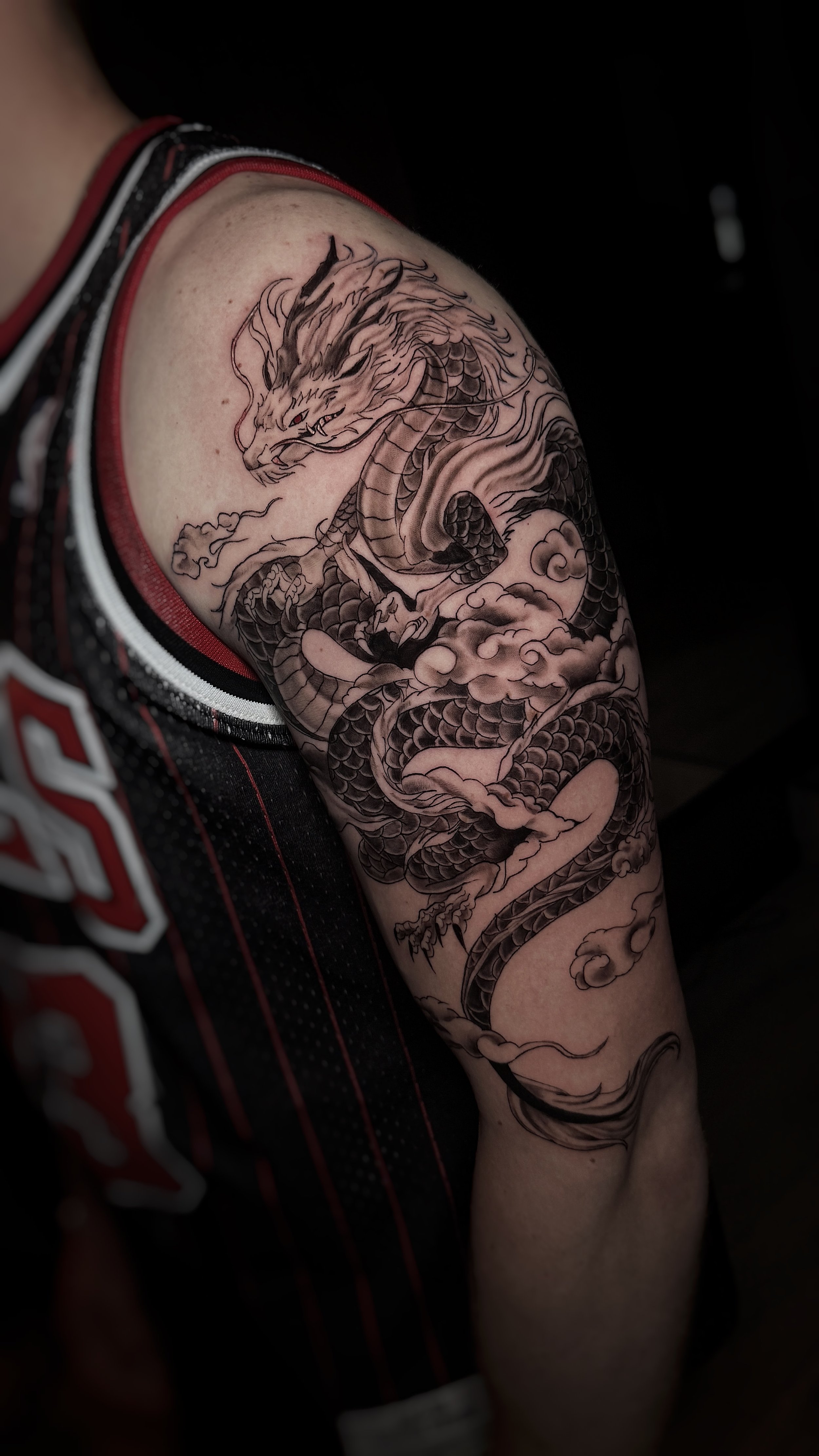 Schultertattoo eines Drachen in Schwarz-Weiß mit Wolken im japanischen Stil.