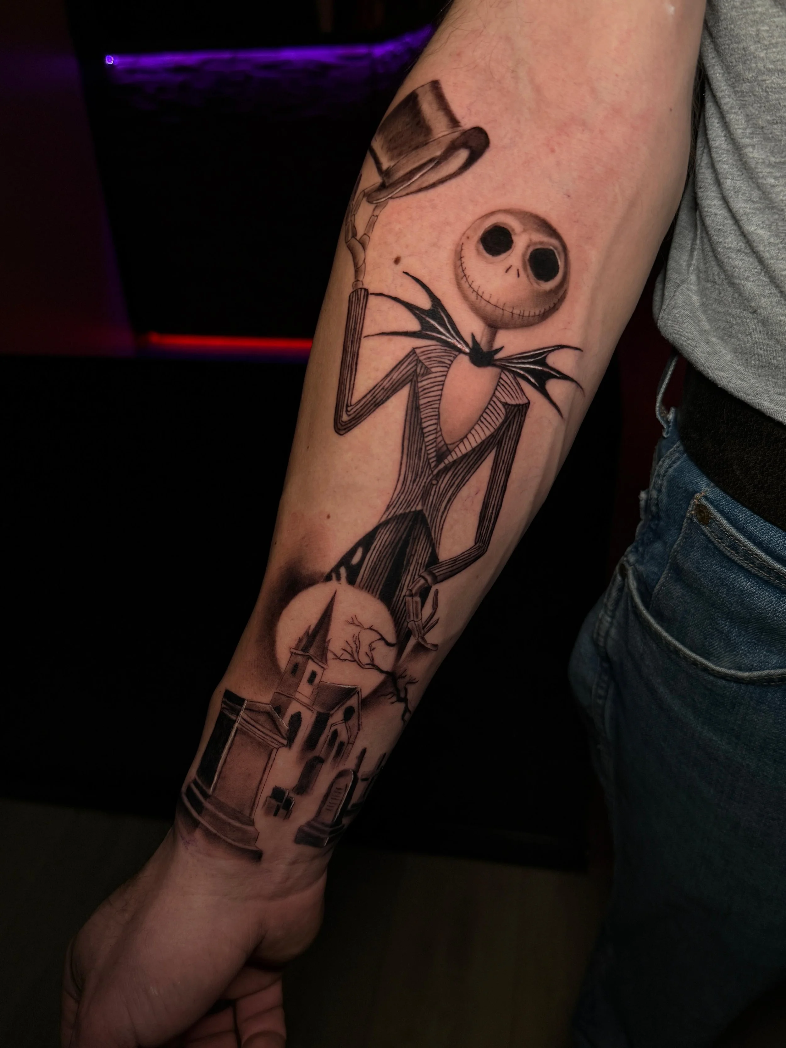Tattoo auf dem Unterarm eines Menschen, zeigt Jack Skellington mit einer Glocke, einem alten Haus, einem baumlosen Baum und einem Friedhof, im Stil von Tim Burton.