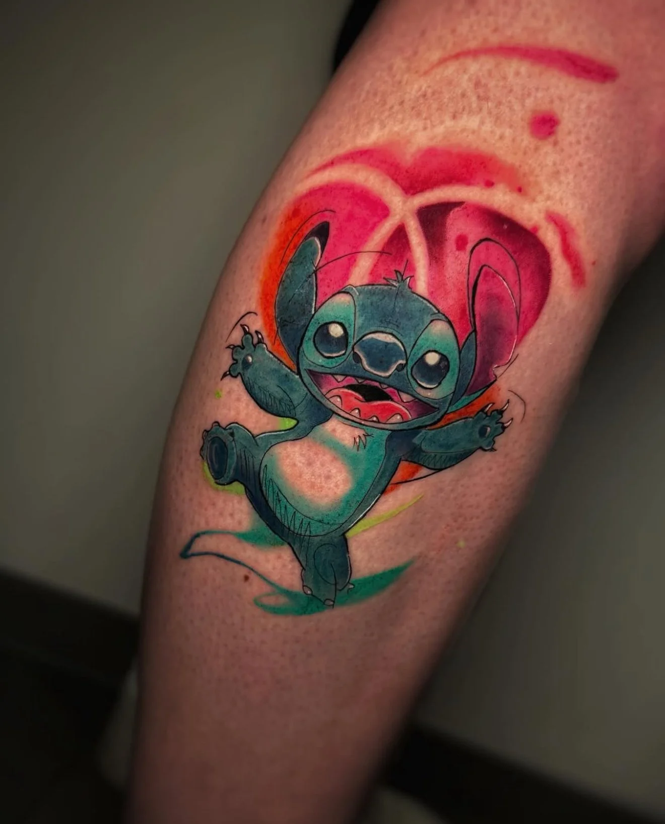 Tattoo eines niedlichen, blauen, lachenden Stitch-Charakters auf dem Unterarm, mit rotem und pinkem Hintergrund.