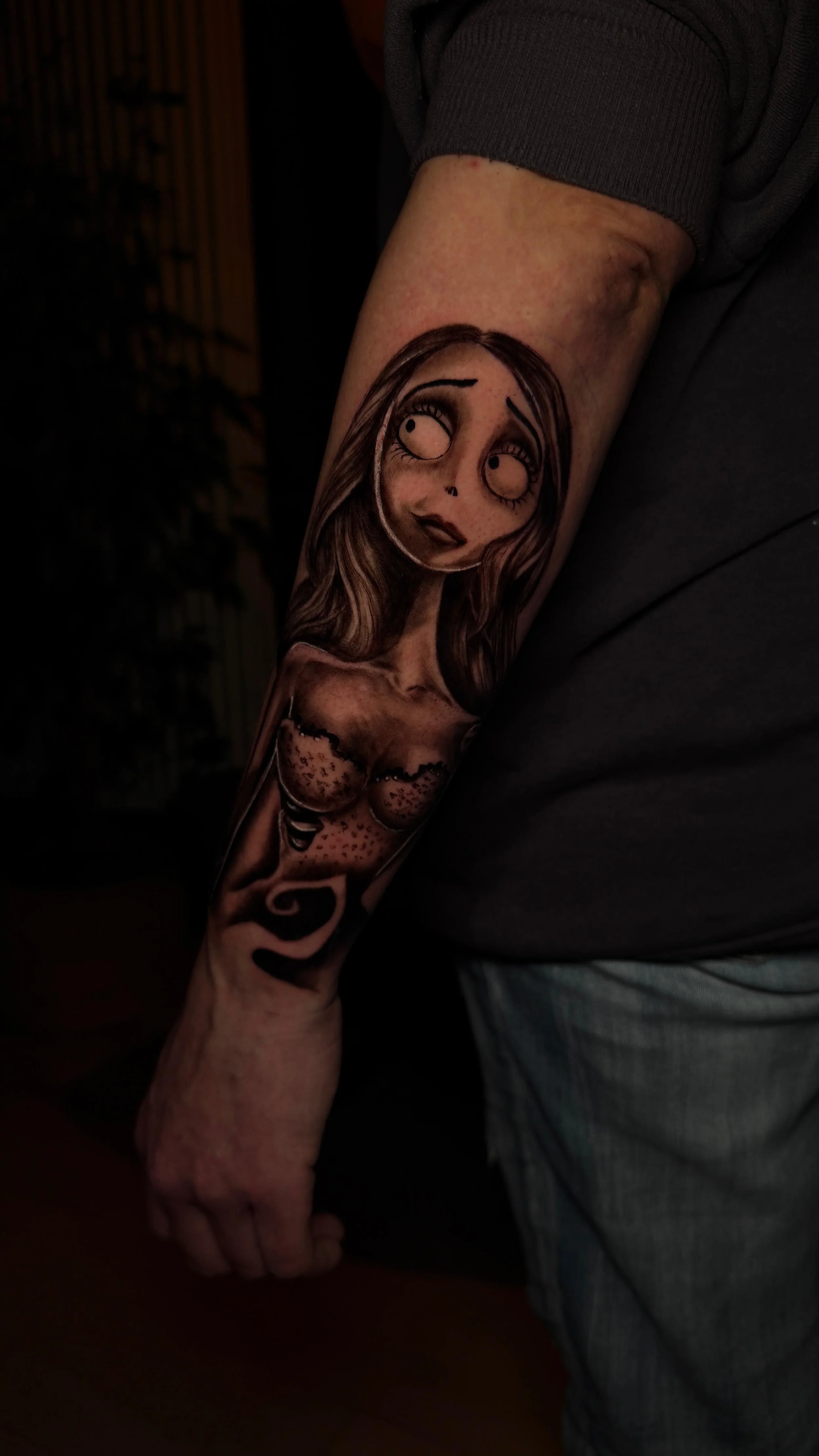 Tattoo eines mädchenhaften Charakters mit großen Augen und langen Haaren, auf dem Unterarm.