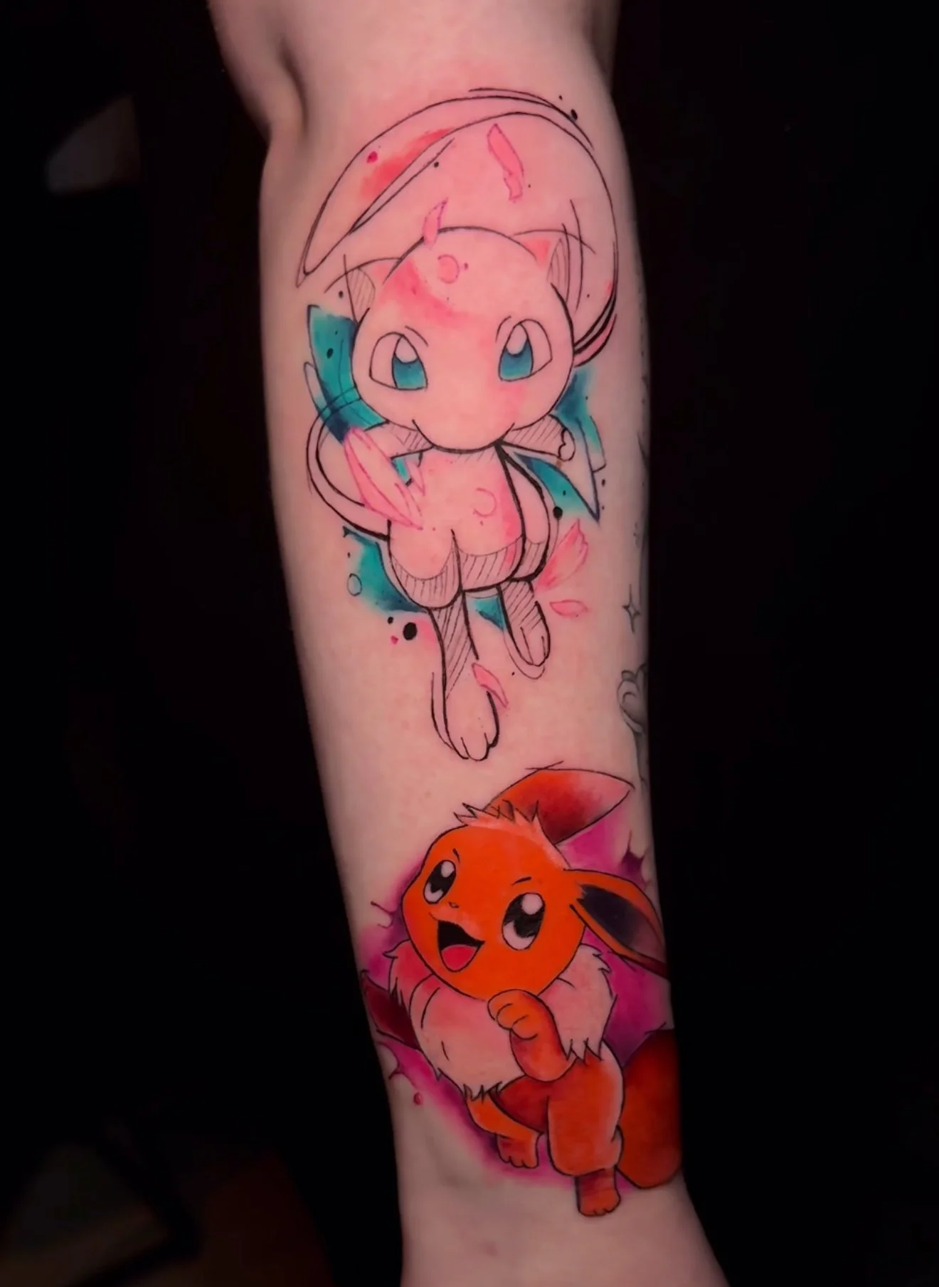 Tattoo auf dem Unterarm mit zwei Pokémon-Charakteren, ein leuchtendes, farbenfrohes Design in Wasserfarbenstil.