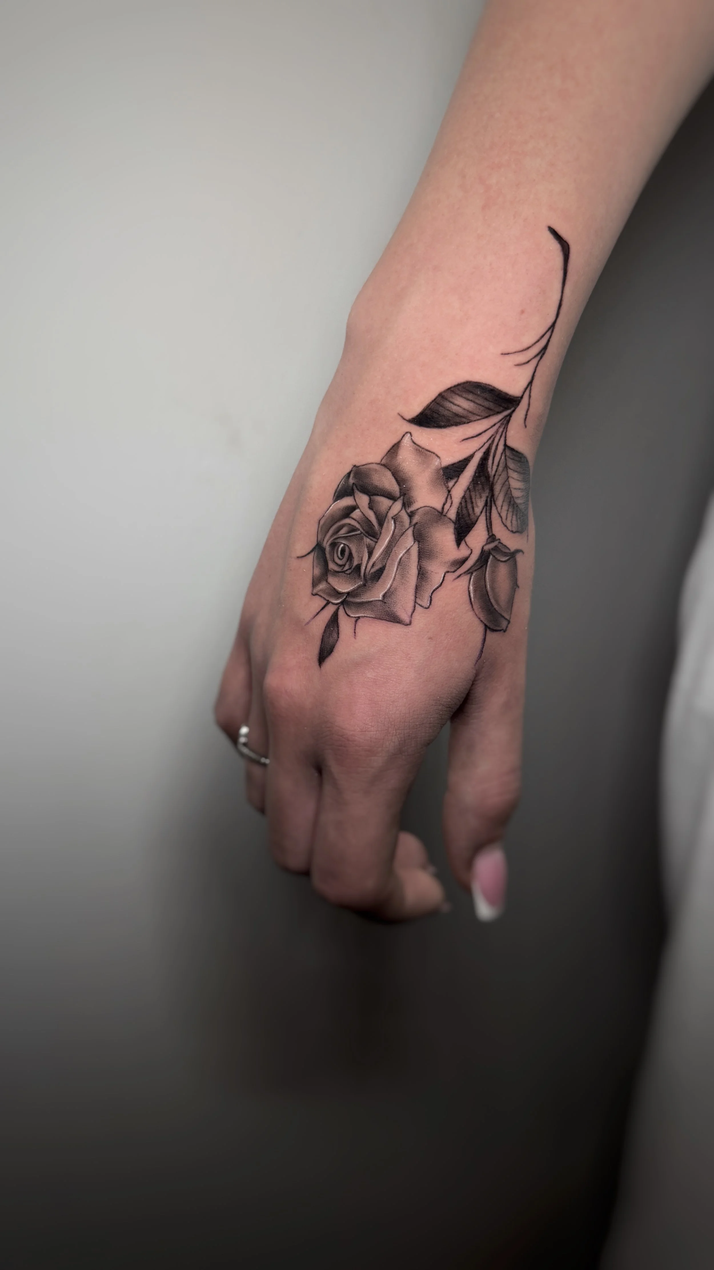 Tattoo einer schwarzen und grauen Rose mit Blättern auf der Hand